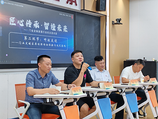 活动现场,浙江罗曼云家居有限公司法人胡大剑、江山市伟峰家居有限公司营销总监钟华等优秀校友们依次将自己在门业定制家居领域的职场经历与成长故事娓娓道来。他们或分享初入行业时的艰辛探索,或讲述在技术创新中突破瓶颈的喜悦,真挚的话语迅速拉近了与学弟学妹们的距离。现场气氛持续升温,同学们纷纷举手提问,围绕行业前沿岗位需求、个人职业规划路径、专业技能提升方法等热门议题,与校友们展开了一场干货满满的思维碰撞。