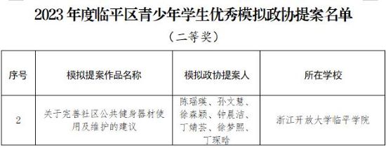 2023年浙江开放大学临平学院学生校外成长导师、区政协委员金丹文和思政教师朱晓燕组成“双导师”,共同指导学生参加模拟政协提案活动。通过实地走访、问卷调查、与相关职能部门座谈交流,同学们发了社区公共健身器材在监管、维护上存在的问题,并提出若干切实可行的完善建议。最终提案《关于完善社区公共健身器材使用及维护的建议》获得全区青少年学生优秀模拟政协提案二等奖。