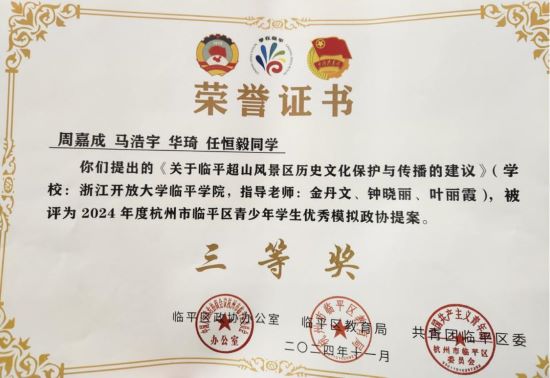 2024年校学生校外成长导师、区政协委员金丹文和思政教师钟晓丽、叶丽霞,继续指导学生参加模拟政协提案活动,通过深入调研,提出提案《关于临平超山风景区历史文化保护与传播的建议》,对当前超山风景区历史文化保护与传播方面存在的问题提出了一些具体可操作的建议,提案最终获得区级三等奖。