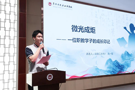 “教育是灵魂唤醒灵魂的事业。”在故事分享环节,22施工大专1班毕业生高一程以“追光者”的视角,深情讲述了在校期间多位党员教师以“匠心”点亮学生技能成长之路的动人故事。班主任邵国平老师也随后上台,表达了对高一程同学的祝福,也现场分享了自己的育人心得。师生之间的分享,传递着教育的温暖与力量,彰显了党员教师的责任与担当。