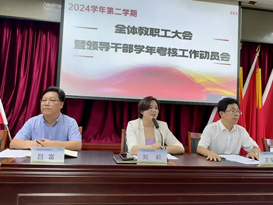7月4日上午,我校召开2024学年全体教职工大会暨领导干部学年考核工作动员会。湖州市教育局党委委员、基教处处长刘莉等考核组成员、校领导班子及全体教职工参会。