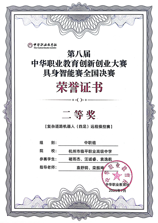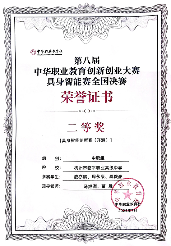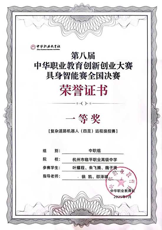 为发展新质生产力,推动具身智能领域的人才培养,第八届中华职业教育创新创业大赛增设“具身智能赛道”。杭州市临平职业高级中学创新创业教研组从四月的全国培训会开始,积极备战。创新创业教研组组织师生积极训练,经过前期备赛、全国选拔赛,最终在全国总决赛中获得佳绩,五支队伍全部获奖,共取得 一等奖1项,二等奖3项,三等奖1项 。