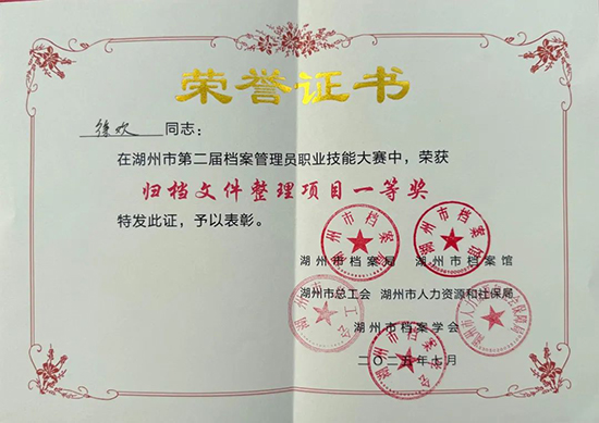 在近期举行的全市档案管理员职业技能大赛中,湖州交通技师学院徐欢老师凭借耐心细致的工作态度、扎实突出的业务能力,一路过关斩将,最终荣获全市归档文件整理竞赛一等奖!