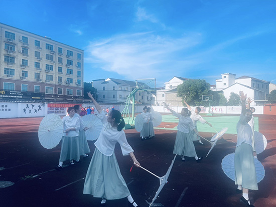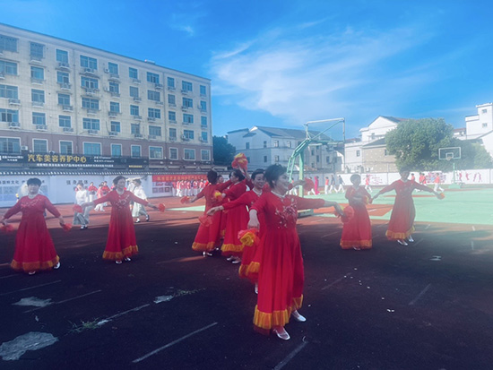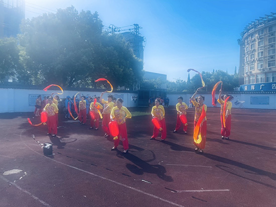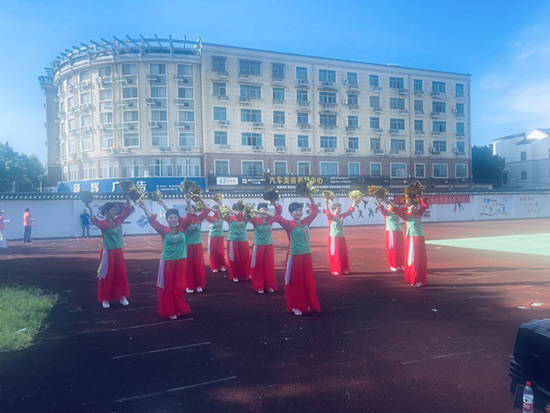 枫之韵艺术团团长骆幼君带着成员合着节拍跳起快乐舞步健身操,在激情的音乐声中队员们做着韵律的动作,舞动轻盈的身姿,在场人员纷纷拿起手机拍照。边上40多人的王冕太极拳队摆起方阵展示二十四太极拳,队员随着典雅的音乐舒展身姿,宏大的阵式、划一的动作,展示出太极拳极大的魅力,还有四十二式、太极剑表演。那里,永宁兜球基地的队员正在展示兜球技艺,10个球在队员手中娴熟地抛入网兜中,赢得周边人员的阵阵喝彩。那边,柔力球的队员正在球网两边角逐,那个球听话似在手拍中舞动,种种技巧展示出队员们熟练的动作。每个场地上到处洋溢着欢笑声。最热闹的当数舞蹈场地,海角社区舞蹈队、楼家社区舞蹈队、马岭村舞蹈队、新东坞村舞蹈队、百树社区舞蹈队、乐山村舞蹈队、东三姐妹舞蹈队及枫桥夕阳红舞蹈队,每支队的队员们好像憋着一股劲,不是比赛却胜似比赛,争奇斗艳,都拿出自己的看家本领,不顾天气炎热,身着盛装合着音乐的节拍舞动矫健的身姿,展示不同的舞种,在不同的音乐风格,充分展示自己的风采,赢得在场人员纷纷拍照、鼓掌,每一个场地都体现“我运动 我健康 我快乐”。