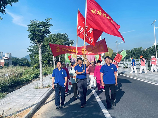 枫桥镇老年体协秘书长王德良宣布活动流程。镇内29个村(社区)的260多名成员两路纵队沿着枫店线到枫山线接口健步走,身着“全民优生活”赞助健身服的成员在“我运动 我健康 我快乐”的横幅指领下精神抖擞地行进在人行道上,路人纷纷驻足观望,极大地增强了人们“全民健身”的意识。
