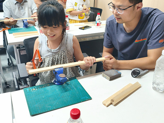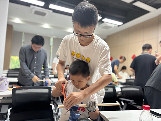 精准聚焦父职教育,方能破解亲子陪伴难题。活动筹备阶段,东信社区妇联便敏锐捕捉到社区家庭教育中“父亲缺位”这一普遍痛点。“不少妈妈跟我们反映,爸爸们其实想参与孩子的成长,却总苦于没合适的渠道。”社区妇联主席姚晨霞道出活动设计的初衷,“所以我们特意设置了木工与射箭环节,就是想契合父亲动手能力强、偏爱竞技的特点,让他们在协作中自然与孩子建立深度联结。”从挑选木料、细细打磨到安装弓弦,父亲们宽厚的手掌包裹着孩子的小手,一同感受木料的细腻纹理与工具的暖暖温度。木艺师傅也不禁赞叹:“妇联这主意真妙!木弓的张力得靠平衡,父子间的默契不也在这一推一拉里慢慢磨合出来了嘛。”