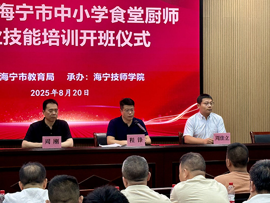 在开班仪式上,海宁技师学院副校长周刚、程锋,现代服务学院院长钱叶萍、副院长周佳立等共同出席。程锋副校长在致辞中强调,校园食堂不仅关系到广大师生的身体健康,更是教育事业稳定发展的重要支撑。参训学员应始终将食品安全置于首位,珍惜这次难得的学习机会。不仅要认真听、认真看,更要积极思考、主动交流,将五星级酒店主厨和专业院校讲师带来的新理念、新技术真正转化为自身的能力。他同时要求全体学员严格遵守培训纪律,确保学习过程安全有序。周佳立副院长进一步明确整个培训的流程,将以“理论结合实践、突出实操实效”为根本原则,围绕“厨房食品安全与食物中毒预防”“现代营养学基础与学生餐搭配原则”“批量菜品标准化生产与控制”“冷菜与卤味的制作安全”“特色面点与营养点心开发”以及“节气食疗与健康套餐设计”等核心模块展开。他希望学员们通过系统学习,不仅能扎实掌握食品安全的关键控制点,更能提升在营养搭配、菜品创新与精细化生产方面的综合能力,最终更好地服务于海宁市中小学的餐饮保障工作。