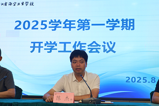 随后,校长陈杰作开学工作报告。他首先回顾了暑期学校取得的成绩:在世界职业院校技能大赛争夺赛中,护理、医技和药学参赛团队实现历史性突破,勇夺1金2银。其中,护理参赛团队不仅斩获金奖,更成为嘉兴中职学校参加世职赛以来首支晋级排位赛的队伍,创造了嘉兴参赛史上的最佳战绩。面对新学期,陈校长指出,学校将从“提升政治站位,强化党建引领”“优化教学管理,提升教学质量”“深化德育管理,落实立德树人”“加强师资队伍建设,打造双师型团队”“深化产教融合,促进协同发展”“推进综合高中试点,探索创新之路”六个方面着力,在全体教师同心协力下,开启学校高质量发展的新征程。