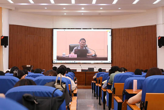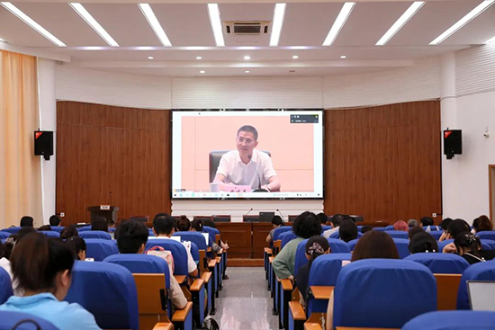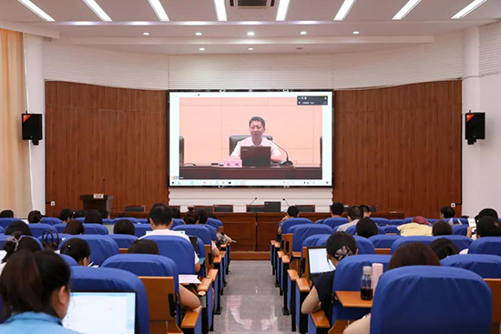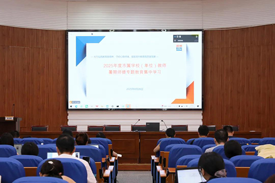 8月26日,浙江省湖州艺术与设计学校全体教职工在学校报告厅观看由湖州市教育局组织的2025年市属学校(单位)教师暑期师德专题教育集中学习视频直播。湖州市委教育工委专职副书记胡卫东主持会议。