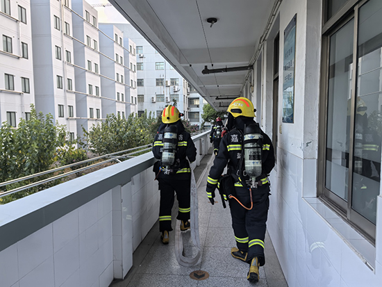 下午15时30分,演练正式启动。模拟女生宿舍二号楼“电路短路”引发火情,浓烟迅速扩散。学校安保人员第一时间触发警报,消防救援力量迅速展开行动,一组负责外围警戒与人员清点,一组架设水枪直击“火点”,一组深入内部搜救“被困人员”,各环节衔接紧密,仅7分钟便完成火情处置,无“伤亡”情况发生。