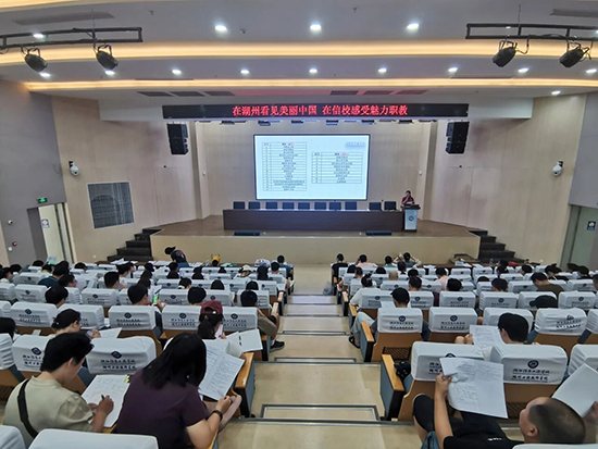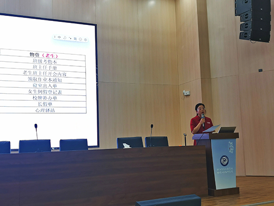 学生处处长杨育萍就开学新生报到流程、物资领取发放、军训事项安排等做详细解读,同时布置了新学期开学的主要工作任务,强调了班主任工作的重要性,从开学报到、家访安排、仪容仪表、宿舍管理、校园安全等方面对班主任提出具体要求,要求班主任树立信心,打开思路,明确方向,丰富德育途径,创新工作方法。