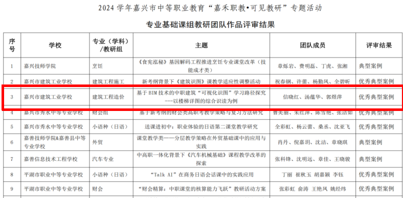 通过本次“嘉禾职教·可见教研”专题活动,工程造价组将BIM技术深度融合教学,学生识图能力实现三大突破:踏面混淆率从72%降至20%,识图效率提升50%,90%学生掌握复杂空间投影逻辑。团队开发的《建筑平面图识读与绘制》校本教材入选30个BIM案例,配套8个动态微课破解教学难点。