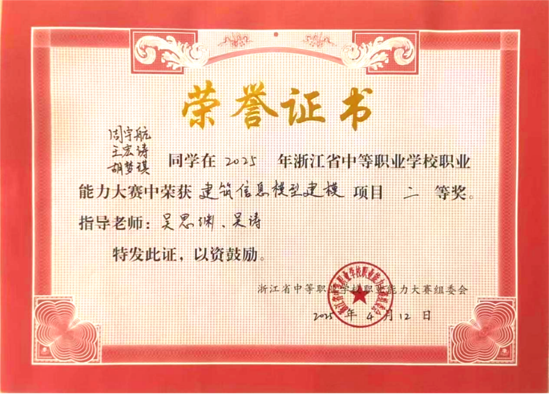 教学成果辐射显著:学生1+X考证通过率超98%,获省BIM竞赛二等奖等多项荣誉。教师团队斩获省级职业能力比赛二等奖、市级教学能力大赛一等奖等佳绩,形成可推广的“BIM+教学”双轨示范成果,为专业建设注入新动能。