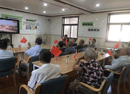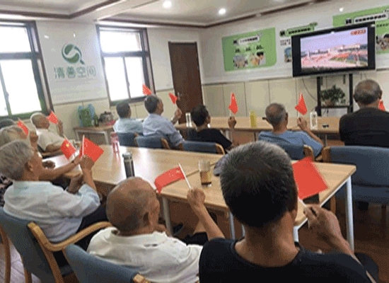 上午9点不到,乐龄教室内已是欢声笑语,老人们手舞小红旗,胸贴小五星,眼晴紧瞪着电视屏幕,生怕错过每一个细节。