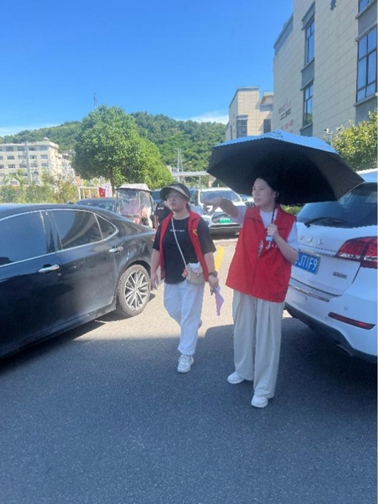 下午2时,党员志愿者们顶着酷暑抵达岗位,身着志愿马甲,迅速进入工作状态。在校园门口,党员教师们分工明确:有的引导送学车辆即停即走、有序驶入指定停车场,避免校门口交通拥堵;有的主动上前,接过新生手中的行李箱、被褥等行李,帮着搬运行李;还有的驻守在校园主干道拐角处,耐心指引报到流程,为新生及家长答疑解惑,“同学,国防教育报到点往这边走”“家长您好,舜华楼寝室在那边,我带您过去”—— 一句句亲切的指引、一个个忙碌的身影,成为校园里最温暖的风景线。