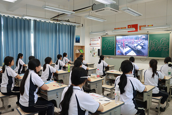 当天9时许,学校师生们早早地打开直播链接,怀着激动的心情等待阅兵活动的开始。画面映入眼帘,阅兵仪式上,整齐划一的方队、先进精良的武器装备依次通过天安门广场,那铿锵有力的步伐、排山倒海的气势,让师生们看得热血沸腾。许多同学都情不自禁地站起身来,瞪大了眼睛,生怕错过任何一个精彩的瞬间。当看到那些首次亮相的先进武器装备时,教室里更是响起了阵阵惊叹声和热烈掌声。