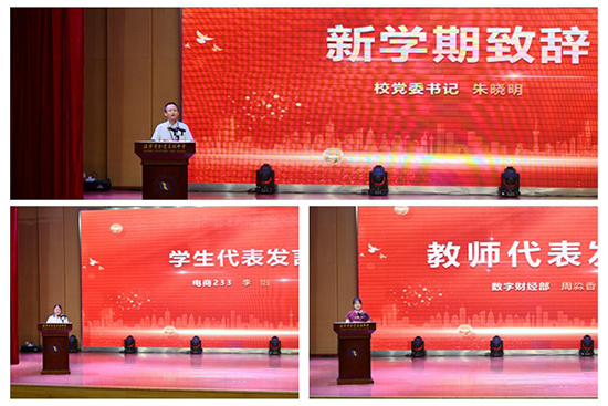 书记致辞。校党委书记朱晓明老师首先对2025级新同学的到来表示了热烈欢迎,紧接着回顾了学校过去一年在教学质量提升、专业升级、服务地方发展等方面的显著成效,如在世界职业院校技能大赛总决赛争夺赛中斩获两枚银牌,思政教学能力大赛入围国赛,教学成果获省级奖项,2025届高考本科上线率达 26.97%等。值此第41个教师节来临之际,朱书记向全体教职工在教育教学、科研、管理、服务等各条战线上的无私奉献表示了真诚感谢,并对全体学生提出了三点建议:一是铸牢钢铁信仰,以国家意志为人生坐标;二是锻造高尚品格,以美好德行为致远之楫;三是锤炼过硬本领,以善学精进为成长阶梯。