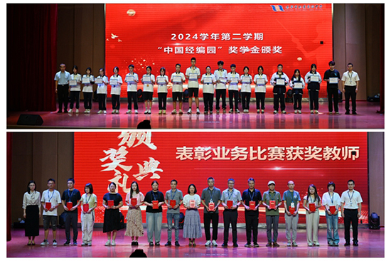浙江海宁经编产业园区开发公司总经理助理刘彦荣先生宣布中国经编园奖学金名单,并与党委委员、副校长何家辉老师一同为获奖学生颁奖。