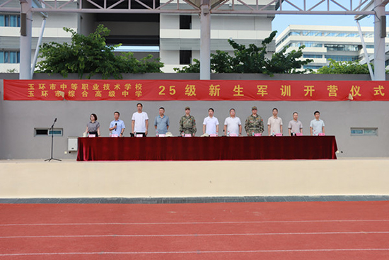 9月7日上午,玉环市中等职业技术学校、玉环市综合高级中学2025级新生军训开营仪式在学校田径场隆重举行。校党总支书记张昌森,校长吴德章,海山乡武装部部长徐伟,楚门镇人武部副部长赵冰峰,副校长陈顺宇、颜申君、吴永胜、张炳良、金松、杨帆,工会主席华平飞等校领导参加。仪式由金松主持。