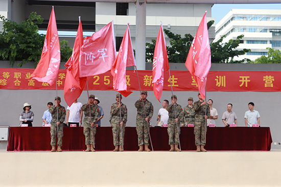 校级领导为军训各连队授旗。鲜红的旗帜在阳光下格外耀眼,接过旗帜的连队代表眼神坚定,这面旗帜不仅是荣誉的象征,更是责任的传递,激励着新生们在接下来的军训中奋勇争先、不负韶华。