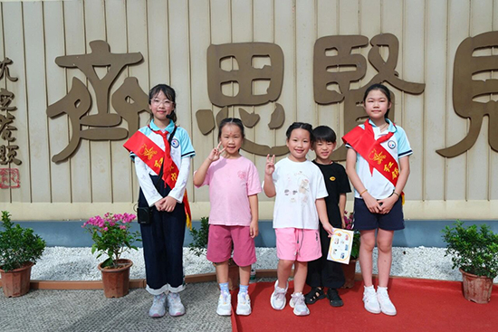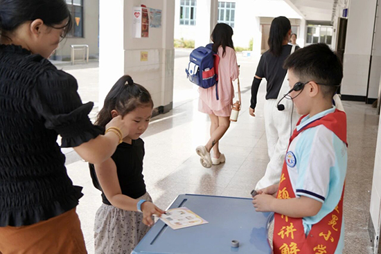 打卡校园:新生们从红领巾小小讲解员手中领取了精美的“游园卡”。在家长的陪伴下,手持游园卡,开启了校园“发现之旅”。七个精心设计的打卡点,将学校深厚的“贤文化”底蕴融入其中:校训碑“见贤思齐”。在小小讲解员的介绍下,新生们第一次清晰了解校训“见贤思齐”,合影留念,将校训精神深植心间。三贤广场(开笔礼)。“学习三贤精神,努力争做王冕小贤士!”小小讲解员的话语点燃了新生们心中的向往。“开笔礼”环节,新生们在家长的陪伴下执笔落墨,书写人生首字“人”——撇捺间诠释“见贤思齐”真谛。以笔墨为舟,载小贤士驶向知理明德的新航程。体艺馆。“强健的体魄是成为小贤士的基础!以后我们会常来这里锻炼身体哒!”新生们感受运动的魅力。书画楼。吴俊朋老师和小小讲解员们向新生们展示书画的魅力:“作为王冕学子,我们要写好字!看,这些都是哥哥姐姐们的优秀作品!”墨香四溢的环境,激发了新生们对艺术的兴趣。党建广场。小小讲解员们在这里向新生们讲述学校的历史:“了解学校,热爱学校,也是小贤士的责任哦!来,和王冕爷爷一起合一个影吧!”历史和笑容在此刻交汇。卫生室。赵双楠老师带着小小讲解员贴心地介绍着:“这里是守护我们健康的地方,不舒服了记得告诉老师来这里找医生阿姨。”新生们在校园里,健康有保障。