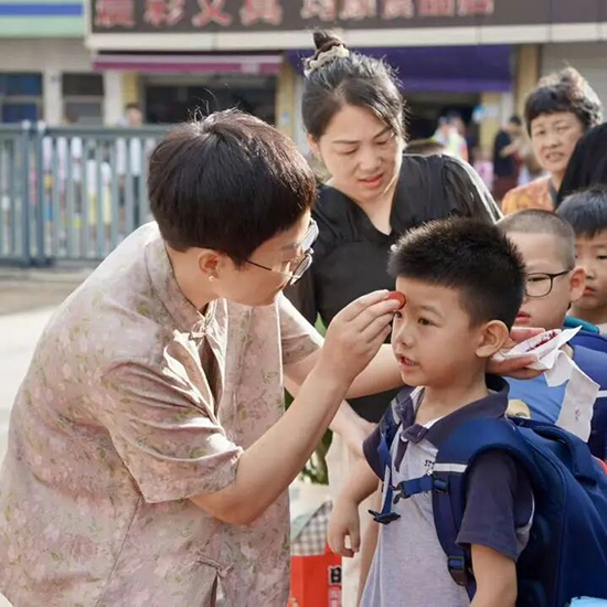 启智明智:“朱砂启智”!新生们拉着爸爸妈妈的手走进校园,赵娜、冯利霞、屠琪锋三位校长等候门口,分别用蘸着朱砂的梅花印章,向每一位新生的眉心点上寓意深远的“红痣”。祝愿从此眼明心亮,好读书、读好书,知贤明理,在浩瀚的知识海洋中扬帆启航。新生们好奇地接受额间的“智慧印记”,家长们纷纷用手机录下这珍贵的瞬间。这一抹朱红,成为了新生们开启小学之旅最深刻的印记。