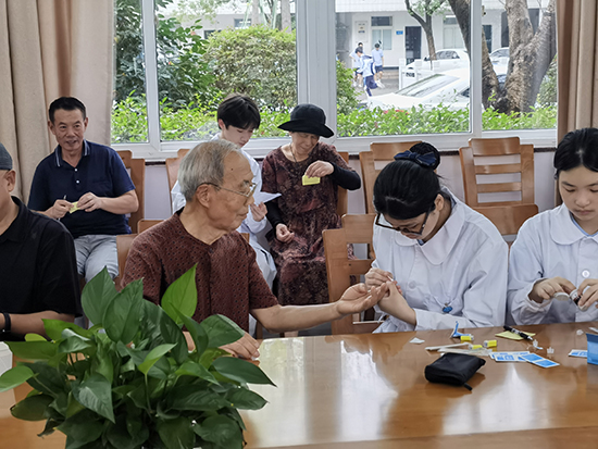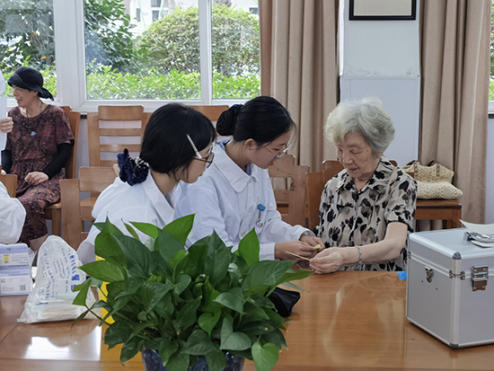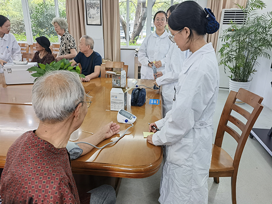 锻炼技能,服务老师。教师节当天,宁波东钱湖旅游学校24护理中高班的同学们发挥专业所学,为退休教师们“健康体检”。