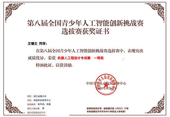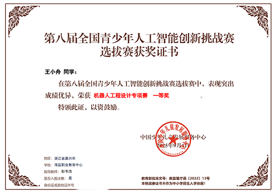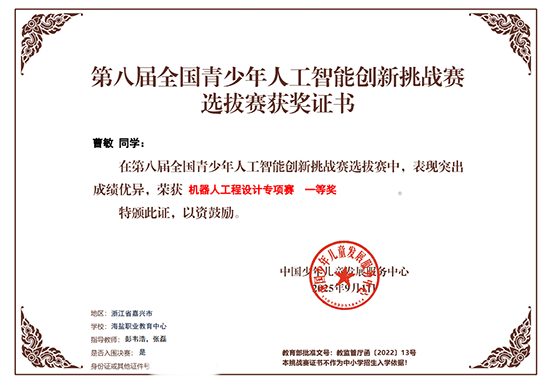 该校负责人表示,此次获奖是学校积极响应教育部关于提升青少年科学素养与创新能力号召的生动实践,不仅充分展现了学校信息工程与电子学部在人工智能领域教学与训练的显著成效,更是学校、学部、教研组以及指导教师团队精诚协作、锐意进取的成果结晶。期待晋级的三位选手珍惜荣誉,戒骄戒躁,以更加精湛的技术和更加沉稳的心态迎接全国高手的挑战,力争在国赛舞台上再创佳绩!(彭韦浩)
