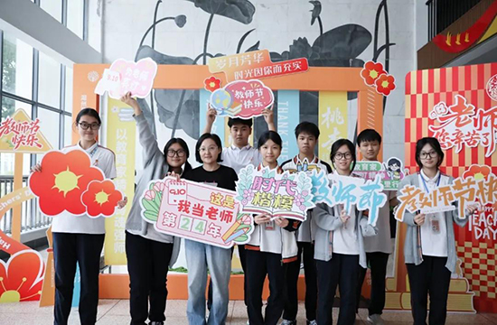 “老师,您辛苦了”“教师节快乐”“桃李满天下”“岁月芳华,时光因你而充实”在写满祝福语的主题背景前,老师们手持节日礼品与特色手牌定格留影。灿烂的笑容、温馨的互动,每一张合影都记录着“2025教师节”的“独家记忆”。