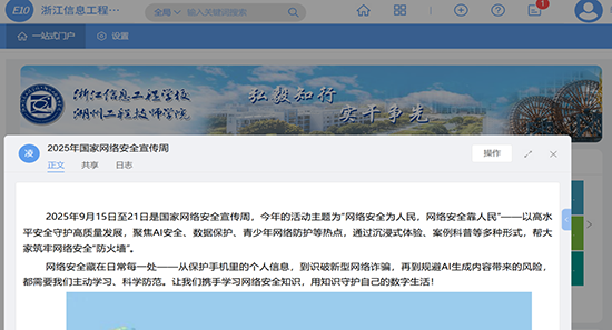 9月15日至21日是国家网络安全宣传周,为深入学习宣传贯彻习近平总书记关于网络强国的重要思想,积极响应湖州市教育系统网络安全宣传周活动,浙江信息工程学校·湖州工程技师学院开展以“网络安全为人民,网络安全靠人民——以高水平安全守护高质量发展”为主题,开展了一系列丰富多彩的宣传教育活动。