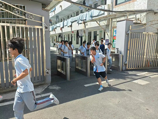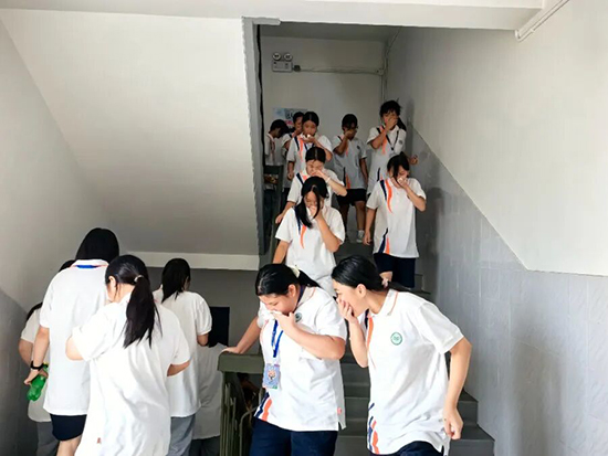 13时,急促的应急警报声划破校园宁静,疏散演练正式启动。各岗位演练人员闻令即动,沉着开展指挥;班主任第一时间组织学生采用低姿弯腰、捂鼻等防护姿势,迅速撤离宿舍楼,沿预定路线有序向安全区域转移。集合过程中,各班整齐列队、肃静有序,班主任精准清点人数,确保无一遗漏,全员到位。