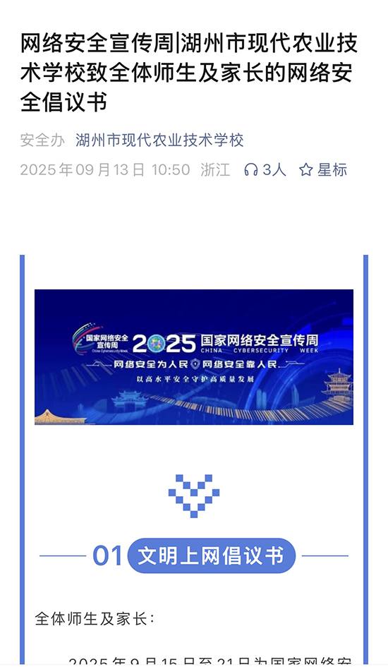 9月15日至9月21日是国家网络安全宣传周。为进一步提高全校师生的网络安全意识,普及网络安全知识和技能,推动校园网络安全建设,湖州市现代农业技术学校开展了形式多样的网络安全周校园日主题教育活动,为全校师生营造安全、健康、文明、和谐的校园网络环境。