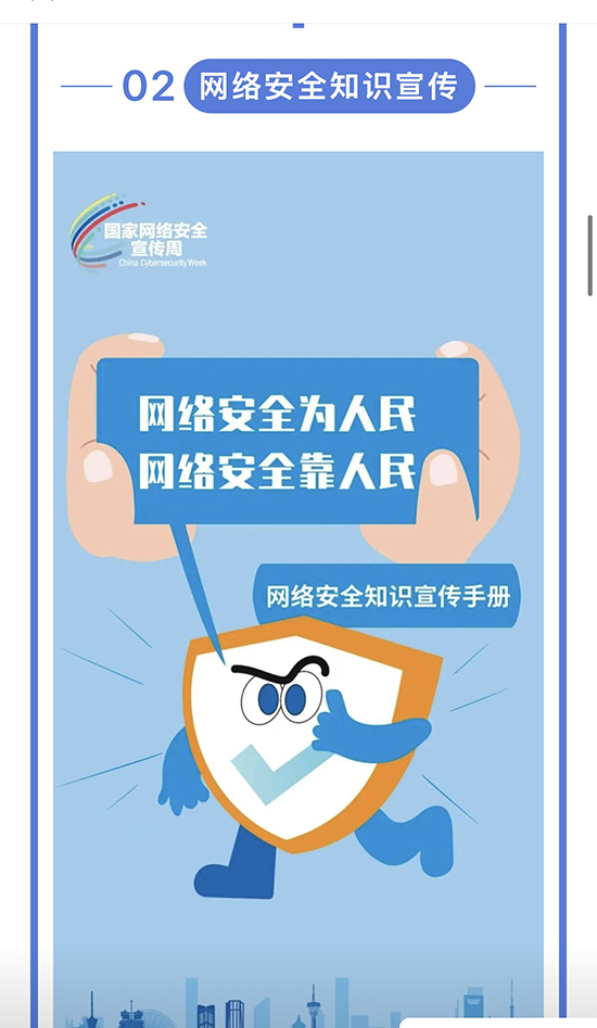推送一期国家网络安全宣传周专题的微信公众号,引导带动师生、家长全面了解网络安全知识并积极防范,提高自身网络与信息安全意识和识别各类网络与电信诈骗方式的能力,从而提高宣传教育周活动的覆盖面和实效性。