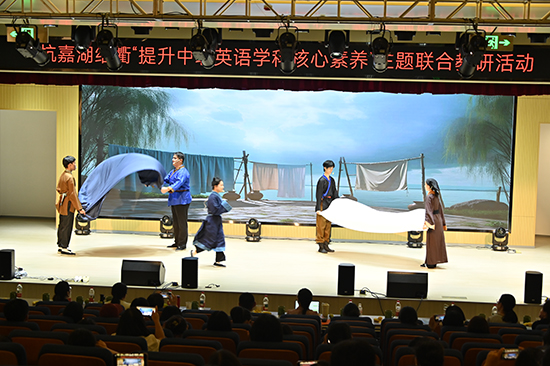 戏剧赋能英语课堂,实现学生语言、技能、文化意识和思维品质等多维目标协同发展,持续进行9年的杭州市中职英语教育戏剧教改探索已经结出累累硕果,活动过程中,乔司职高学生表演了课本剧《徐霞客》,临平职高教师表演了戏剧《詹天佑》,成为活动的一个亮点,学生与教师同台,用戏剧激活语言,用文化点亮自信,英语学习“活”了起来,呈现了中职英语学习产出的多种可能性,展现了师生通过教育戏剧所呈现出来的良好综合素养。