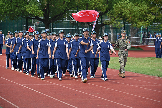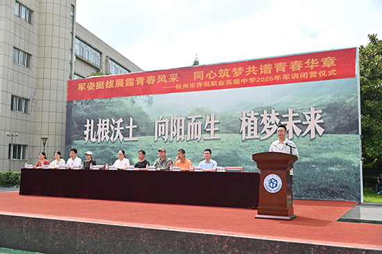 杭州市临平区乔司街道人武部承担本次军训指导,在开营仪式上,学校领导向军训团授旗,副校长喻新凯作动员讲话,他希望同学们端正态度,顽强拼搏;团结协作,互帮互助;遵守纪律,服从指挥,圆满完成军训任务。