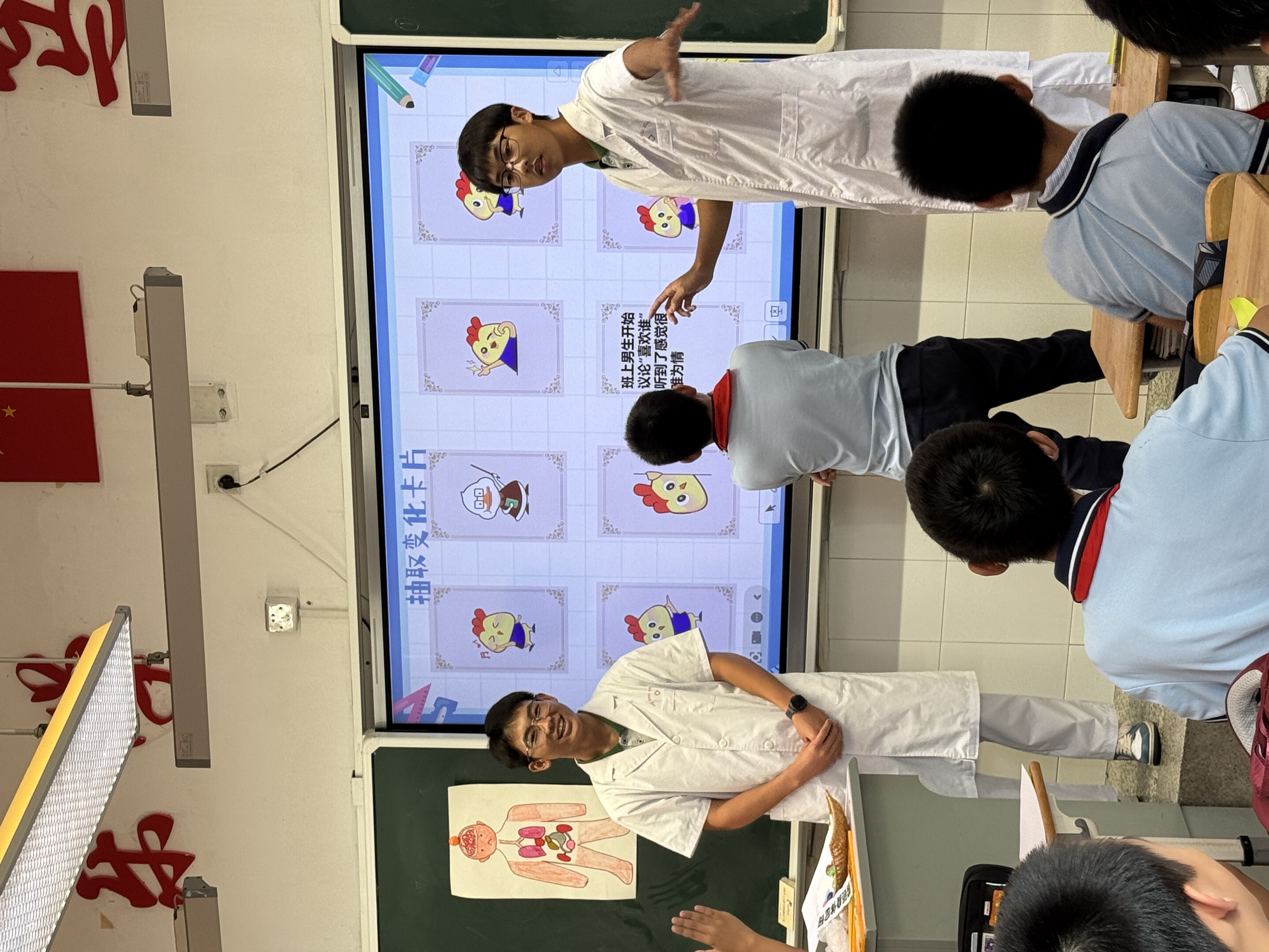 活动以抽卡互动开场,孩子们抽取“变化卡片”,分享自己对身体变化的感受。学校学生引导大家认识到,身高增长、声音变化、月经初潮、遗精等现象都是自然的成长过程,无需紧张或害羞。学生巧妙运用“身体升级系统”的比喻,将人体比作精密仪器,生动解释生理变化的意义。例如“声带如琴弦拉长,音调由童声转为成人音域”“新陈代谢促进细胞更新”等讲解,让孩子们在趣味中理解身体的“升级”过程。现场设置了问答和“刮刮应对策略”游戏环节,小学生踊跃提问,学校学生耐心解答,传授正确使用卫生巾、应对月经和遗精等实用知识,帮助孩子们建立自我保护意识。活动特别强调“个体差异”,通过展示男女青春期发育时间表,让孩子们理解发育早晚皆属正常,学会尊重自身节奏,不比较、不焦虑,接纳独一无二的自己。