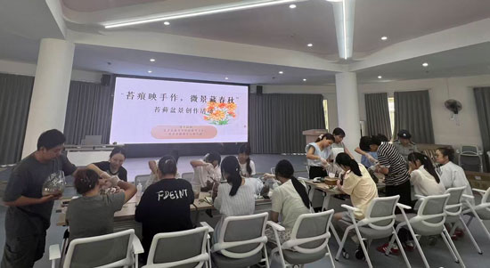 活动现场邀请了专业手工制作师王煌斌进行指导教学。王老师从苔藓的特性、盆景构图原理、材料搭配技巧等方面进行了详细讲解,并现场演示了苔藓微景观的制作步骤。参与者们在老师的指导下,亲手将苔藓、绿植、砂石等材料巧妙组合,创作出一个个充满生机与意境的微型生态景观。