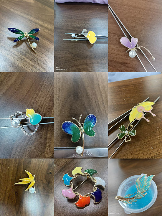 课堂伊始,社区活动室内已是金丝闪烁、彩釉流转,一场指尖上的传统工艺初体验悄然开启。徐梦晓老师从掐丝珐琅的渊源历史讲起,逐步分解制作步骤,通过细致讲解帮助学员轻松迈入珐琅世界。实操环节,大家手持专用小勺,一丝不苟地绘制图稿、精细掐丝细心填彩,翠绿为叶,鹅黄作瓣,轻抖手腕控制釉料浓淡,换色前不忘擦拭工具,避免混色。随着彩釉徐徐铺展,素白银胚渐渐生动,一件件独一无二的珐琅胸针在居民手中初见形态。灯光之下,釉色晶莹流转,韵味自成,大家看着自己亲手完成的掐丝珐琅作品,那份成就感与自豪感油然而生,大家纷纷举起自己首次完成的珐琅胸针相互展示。