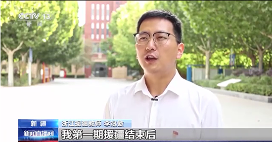 报道中,浙江省玉环市援疆教师李斌傲接受采访。他表示:“作为一名95后援疆教师,我第一期援疆结束后,又主动申请再一次援疆,投身援疆倍感光荣。我们要接续努力,一批接着一批干,为新疆教育水平提升和人才培养,尽自己所能做好工作,传承‘胡杨精神’,和新疆各族干部群众一起谱写中国式现代化新疆篇章。”