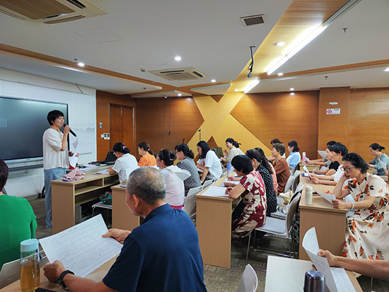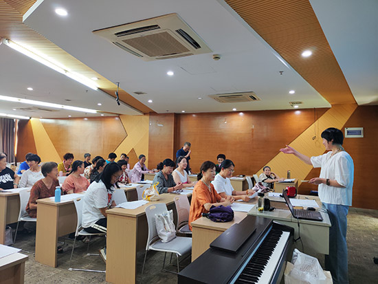 课程伊始,吴老师先让学员们进行自我介绍、互相认识,有基础的学员还哼上几句越剧,让老师把把关看看基础,也惹得学员们开怀大笑,大家在欢声笑语中破冰。本次课吴老师教的是《何文秀—心连心选段》,吴老师从基础唱腔入手,逐字逐句指导学员把握音准与节奏,同时示范经典身段动作,如兰花指、台步等,耐心纠正细节姿势。学员们神情专注,手持曲谱认真跟练,时而轻声哼唱,时而模仿身段,遇到疑问及时向老师请教,互动氛围热烈。