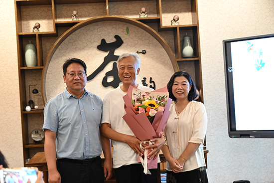 学院邵晓舟书记向潘会基老师献上鲜花,祝愿潘老师在支教岗位上工作顺利、桃李芬芳,并祝全体退休教师国庆、中秋双节快乐。
