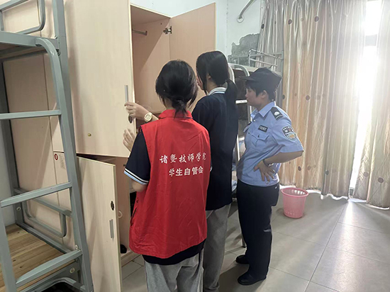 “请班主任整好队”“各班按次序等待检查”“请把皮箱、衣柜打开”……10月13日下午,诸暨技师学院安管处联合诸暨市城东派出所对学生寝室开展了管制刀具等违禁物品突击检查。