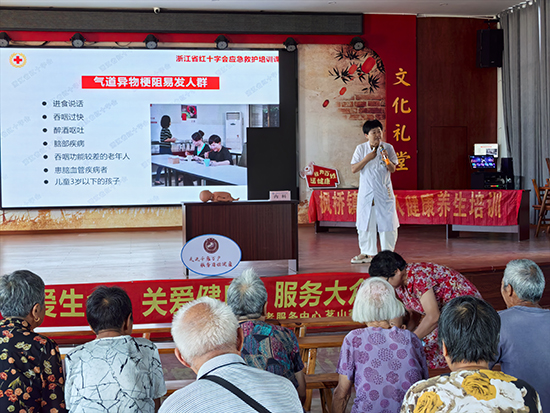 卓周平以《气道异物梗阻》为主题讲解,围绕“何谓气道异物梗阻”“怎样识别”“如何处置”“总结”四大模块,用通俗语言结合清晰图示,明确气道异物梗阻是“呼吸道任一部位被异物阻塞,导致呼吸不畅或完全中断”的危急情况。她列举了生活中易引发梗阻的“吞咽过快、醉酒呕吐”等7类场景,台下老人纷纷点头认同,直言“这些情况常碰到”;同时特别提醒“花生米、黄豆、葡萄干”等食物,以及“纽扣、小玩具、笔帽”等物品的潜在风险,建议老人照看孙辈时提高警惕,避免意外发生。在处置方法环节,卓周平详细区分“不全梗阻”与“完全梗阻”的不同表现,重点讲解“咳嗽自救”“背部叩击”“腹部冲击法(海姆立克法)”“胸部按压法”四种应对方式,示范海姆立克法的操作要点,引得老人们跃跃欲试,直言“多学一种方法就多一份保障”。她特别强调,一旦发生梗阻,首要步骤是“紧急呼叫急救中心”,交由专业人员处置,确保救援科学有效。
