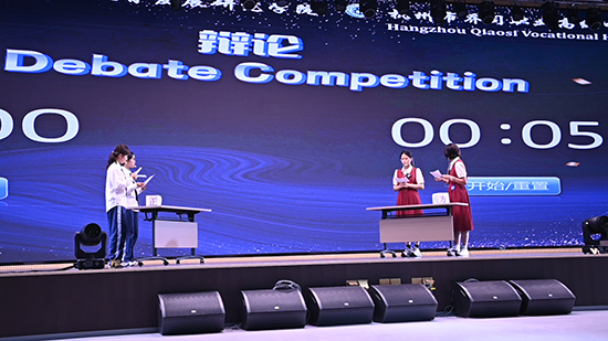 学生技能比赛先通过“听力+阅读”笔试,随后,进行职业情景表演和辩论赛。选手在抽取题目后10分钟准备,然后在90—120秒内完成情境表演。同样的,辩论赛选手准备后,在4分钟内正方反方展开激烈辩论。选手们反应敏捷、表达流畅,用英语化解临场挑战,展现出扎实的语言功底和团队协作力。