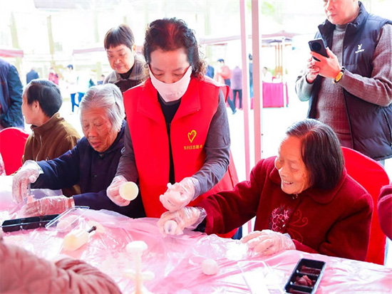 实操环节中,老人们热情高涨,在杨老师和现场志愿者的贴心协助下,纷纷动手尝试。大家按照教学步骤,取冰皮、揉圆、压平,放入喜爱的馅料,小心翼翼地包裹均匀,再放入模具中按压成型。一个个造型精致、色彩诱人的冰皮月饼逐渐在老人们的手中诞生。过程中,大家相互交流技巧、分享经验,活动现场充满了欢声笑语。