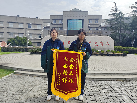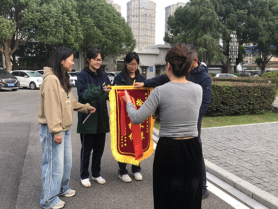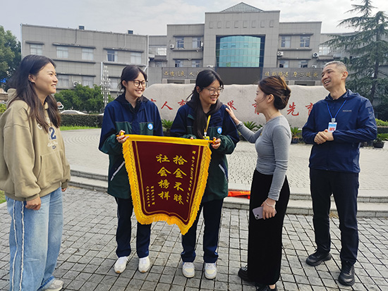 这份感动并未止步于电话。10月27日,失主女士专程来到海宁卫生学校,将一面书写着“拾金不昧 品德高尚”的锦旗送到了两位同学手中,当面向她们表达了诚挚的谢意。她说:“从这两个孩子身上,我看到了海宁卫校学生优秀的品质和良好的教养,你们学校的育人成果,值得肯定!”