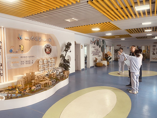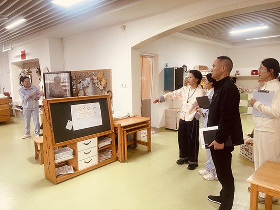 调研团队实地察看了幼儿园环境创设、园舍装饰及区域角设置情况。经前期改造升级,园舍面貌焕然一新,整洁清幽的环境中,活动区、功能区、种植区与游戏区规划规范有序。操场上,充满童趣的玩具设施适配幼儿活动需求,食堂二楼专门规划的雨天活动区域,实现了幼儿全天候室外活动的保障。教室内,区域角、观察区、休息区等功能分区布局合理,独立卫生间与洗漱区配套齐全,幼儿们礼貌热情的问候赢得调研人员一致称赞。