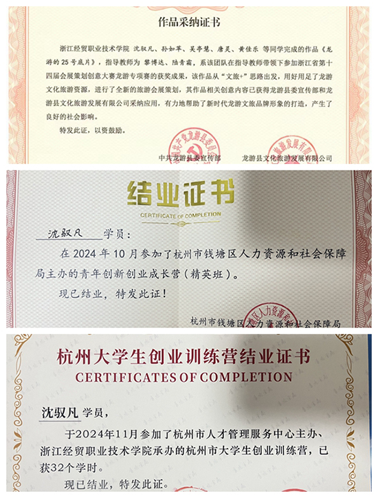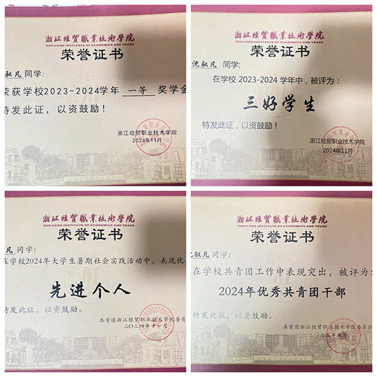 沈驭凡,男,平湖市职业中专工艺美术2023届毕业生,现就读于浙江经贸职业技术学院传播与策划专业,大学期间担任团支书、院融媒体中心副负责人及校全媒体中心影像制作部部长等职务。他的实践足迹辐射校园、乡村直至国际舞台,曾以导演助理身份参与国家广电总局、中央广播电视总台纪录片制作。他累计获国家级荣誉4项、省市级奖项16项。2025年,他获得了浙江省普通高职院校国家奖学金。
