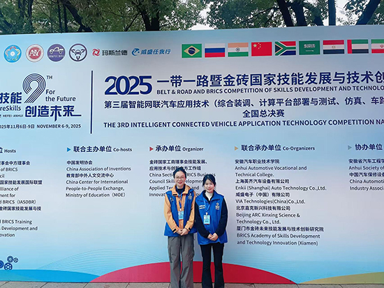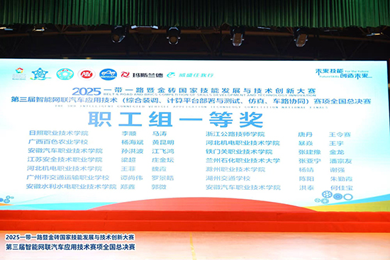 2025一带一路暨金砖国家技能发展与技术创新大赛第三届智能网联汽车应用技术赛项全国总决赛于11月7日至9日在安徽汽车职业技术学院举行。湖州交通技师学院教师团队凭借扎实的专业功底、默契的团队协作与出色的临场发挥,一路过关斩将,成功斩获职工组一等奖(金牌)。