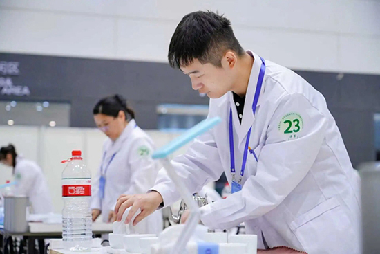 毕业后,翁致远始终保持着对技能提升的追求,密切关注人社部门、成校组织的职业技能培训,主动选择感兴趣的领域深耕。2022年,他报名参加评茶培训,不仅顺利考取高级评茶员证书,更在学习中加深了对茶文化的热爱。从嘉兴市赛的初露锋芒,到省赛的层层突围,再到站上全国赛场,他的备赛之路满是汗水:因肢体残疾,他在实操动作、感官判断上需要付出更多努力,赛前60余天的集中训练里,他研习200余种茶样、开展300余次模拟赛事,始终绷紧“严谨备赛”这根弦,用反复打磨的技艺弥补差距。